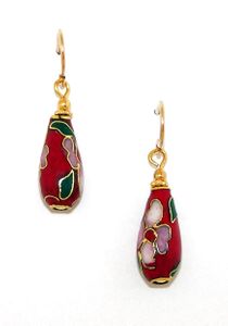 Cloisonne Teardrop Earrings enameled in red with the traditional cloisonne flower on both sides. Accent colors include mauve, white, & green. Drop Length: 7/8" approx.