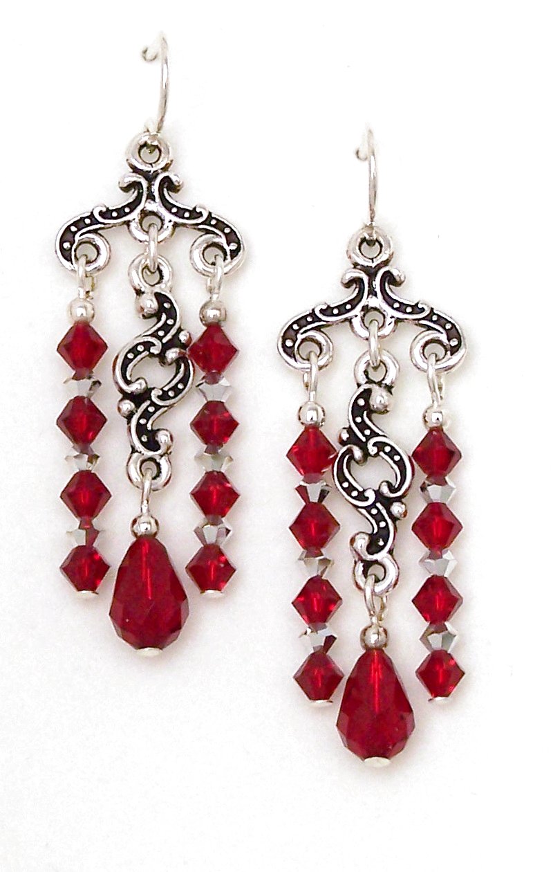 Red crystal chandelier earrings made with two sided plated pewter "keepsake" chandelier toppers, two sided "minuet" center links with teardrop crystals, eight 4mm siam red bicone crystals and six 3mm gold or silver crystals.