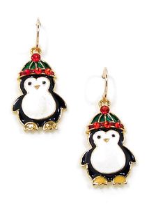Fancy Penguin Earrings are gold plated charms, enameled in black & white with yellow flippers and beeks and green and red Christmas hats accented with sparkling crystals.